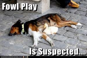 I had a hen who used to try and peck the dots off my Dalmatian. They both used to sleep on his trampoline bed and were the best of mates. 🙂
