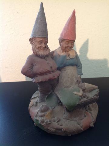 Due to our financial situation at the time, we left that little store with only a little round pin and a calendar, but both had special meaning for us–and still do. The pin says, “To Gnome me is to love me” and depicts a young gnome couple sitting on the long neck of a goose as they fly off on their honeymoon. The calendar has a large version of that photo and 11 other large illustrations of Gnomes.