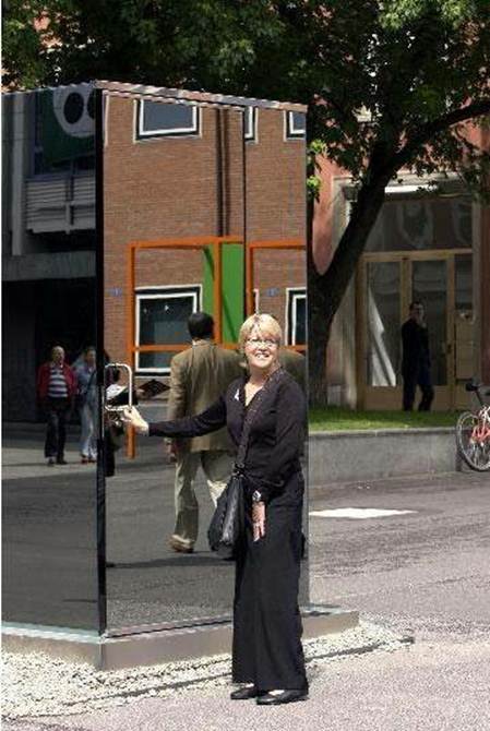 The mirrored facility with the woman holding the door is the same restroom/toilet room that is completely transparent from the inside. I have to say that even if I new for certain that no one could see it, I'd probably feel exposed using it.