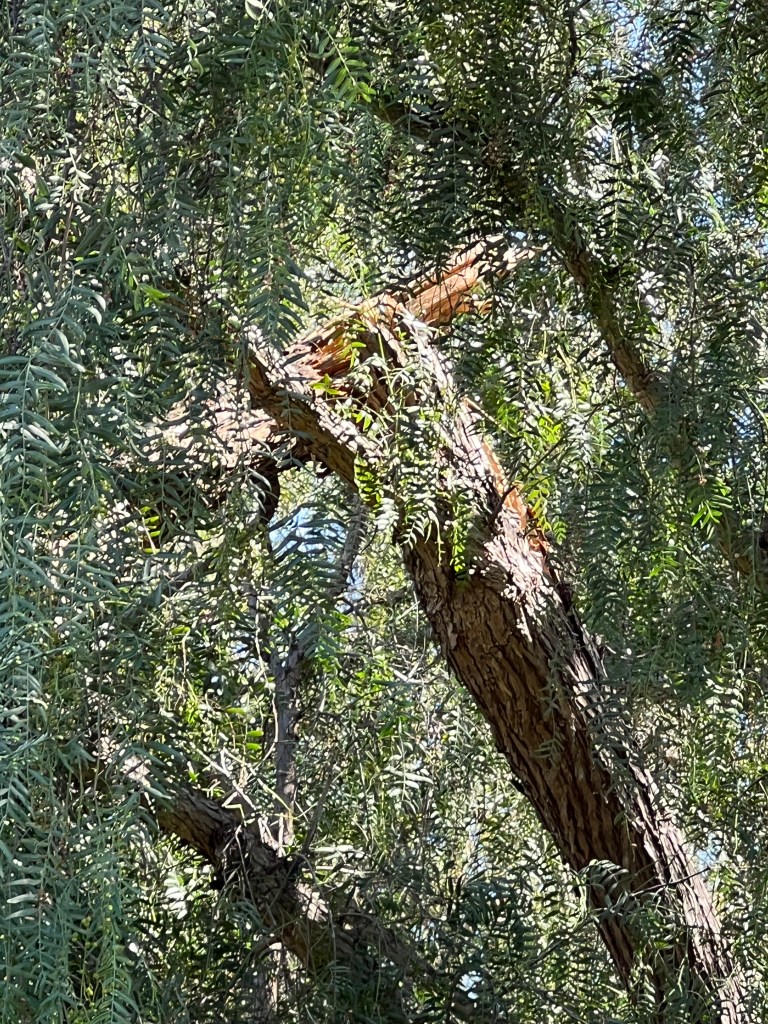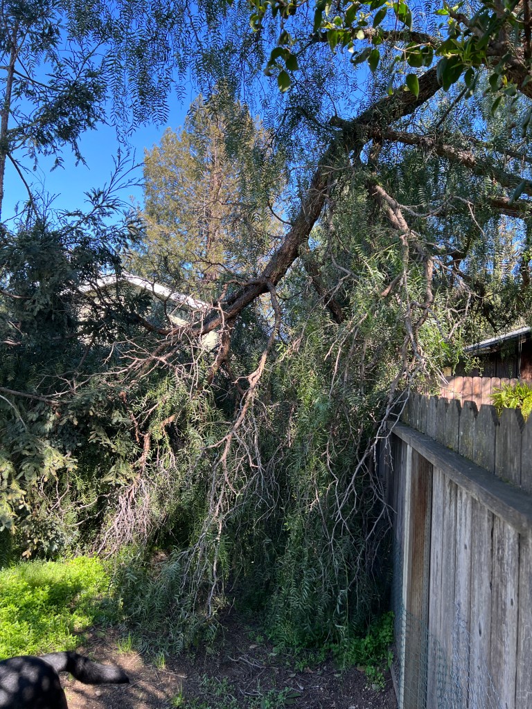 In a recent storm a large branch of a peppercorn tree shattered and crashed over our back fence and crushed one of the smallest redwoods. I now only have five healthy redwoods of the eight that were planted about ten years ago. The drought got one, and branches from the peppercorn tree crushed two others about a year apart. Amazingly, our ancient fence was completely spared.