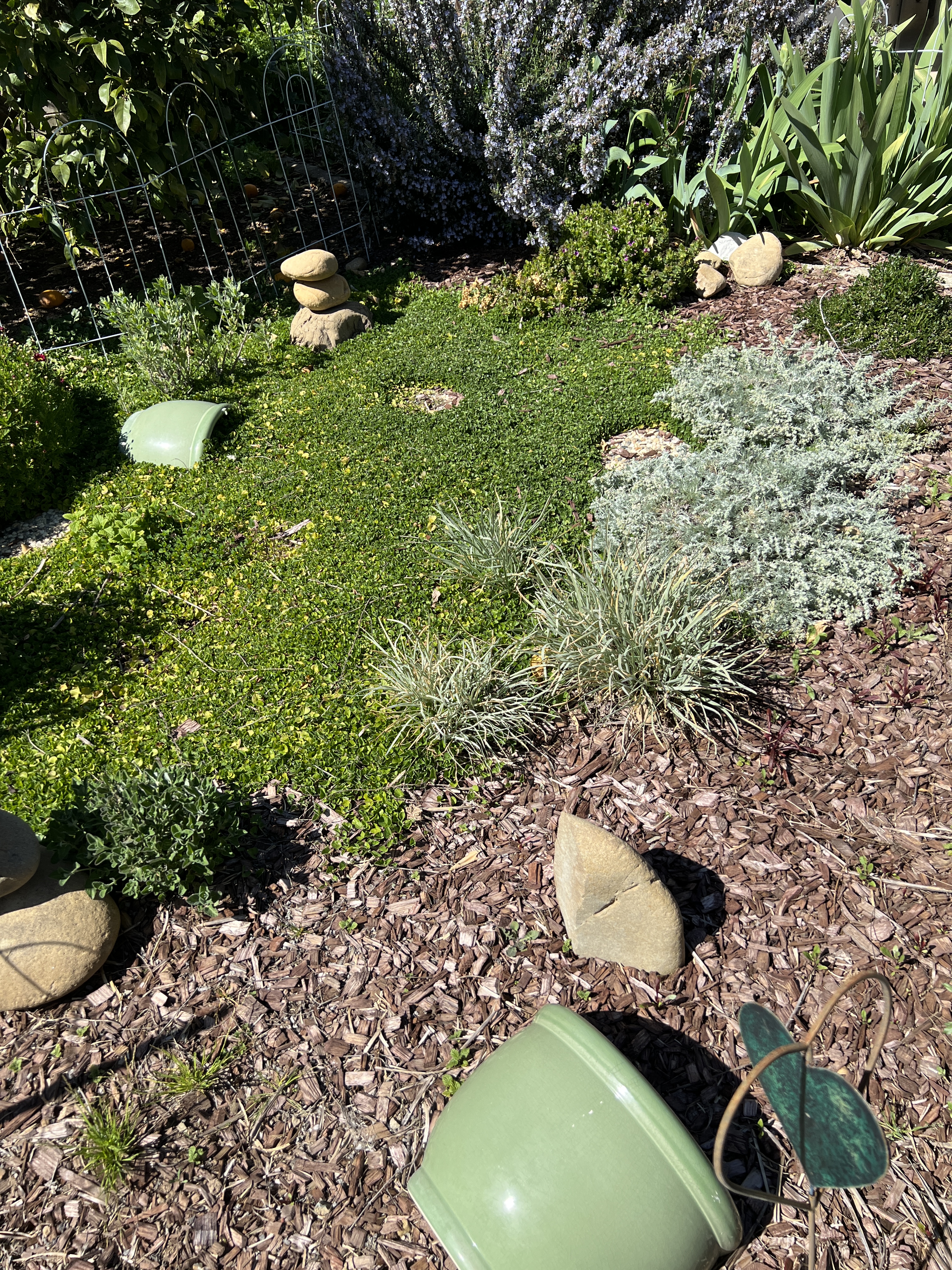 Speaking of fences, My Beloved has been building them to keep the dogs out of the mini-gardens she’s creating. Below is a photo of one.